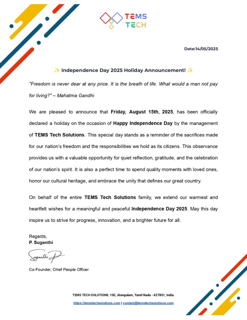 We are pleased to announce that Friday, August 15th, 2025, has been officially declared a holiday at TEMS Tech Solutions in celebration of Independence Day.